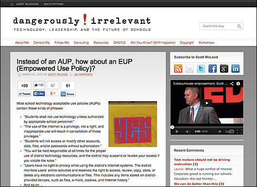 I have long struggled with the existence of lengthy, prohibitive Acceptable Use Policies which serve only to provide the illusion of CYA for schools/teachers while having a chilling effect on teaching and learning with the tools we are putting into teacher and student hands.